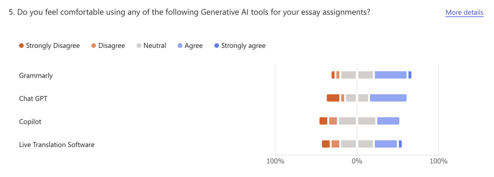 This information would allow the university to see if a larger proportion of international students were using AI tools but this wouldn't help them to understand why. Instead, we should have asked the participants to state their home country, this would then help to pinpoint if people who didn't have English as a first language were more likely to use these tools to help their studies.